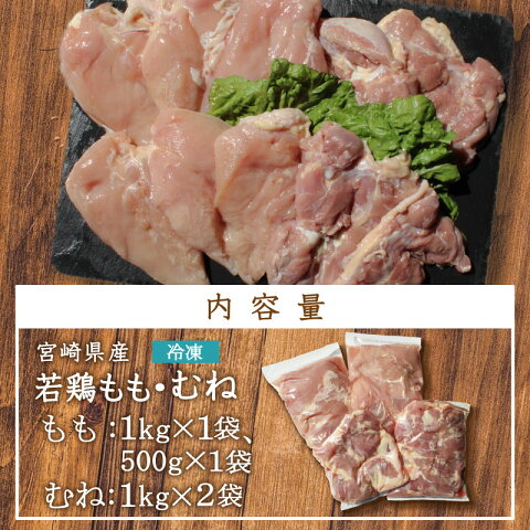 名称 宮崎県産若鶏合計3.5kgセット 産地名 宮崎県産 内容量 若鶏もも肉1.5kg(1kg×1袋、500g×1袋) 若鳥むね肉1kg×2袋 賞味期限 冷凍60日 保存方法 冷凍 ◆ご使用上の注意◆ ・真空パックの際に万全を期しておりますが、配送中などに袋が破れる場合がございます ・解凍する際は、ドリップ等が漏れる心配がございますので、トレーなど容器にいれて解凍してください。