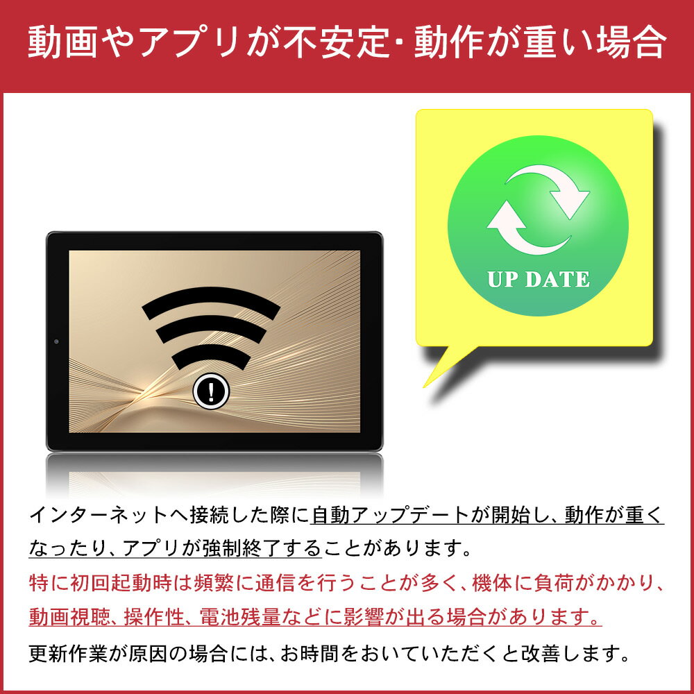 リチウムイオン電池 3.8V 7,000mAh 充電時間 約5 時間(0 〜 5% から100% の充電になるまでの時間) 駆動時間 約11時間(画面明るさ50% でYoutube をライブ視聴した場合) ボタン 電源ボタン・リセットボタン音量+ボタン・音量-ボタン OTG USB Type-C(フラッシュメモリ、USBハブ、USBオーディオ認識可能)※2 マイクロSDカードスロット 1ポート イヤフォンジャック 1ポート スピーカー 内蔵(8Ω/0.7W スピーカー)×1 マイク コンデンサーマイク内蔵 AC充電ポート 1ポート/ 5V対応 付属ACアダプタ 入力:AC100-240V 50-60Hz出力:5V 2Aケーブル長:約70センチ 無線LAN IEEE 802.11 ac/a/b/g/n 2.4GHz 5.0GHz [W54/W56]対応 Bluetooth Ver4.1対応 接続 Miracast対応/WiFi-Direct対応 カメラ フロント:500万画素、リア:800万画素高画質デュアルカメラ G-Sensor 搭載※3 GPS 搭載※4 FMラジオ 搭載※5 本体重量 555g※6 本体サイズ 約縦253×横163×厚さ8.2mm(突起物除く) 付属品 USB電源アダプタ・USBケーブル・保証書×1枚・イジェクトピン 保証期間 1年間 ※社名及び製品名は各会社の商標または登録商標です。