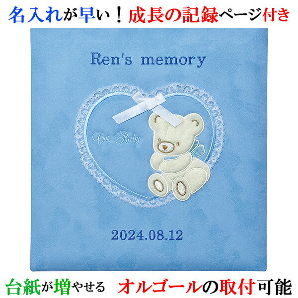 フォトアルバム(名入れアルバム)について ・クリエートアルバムは、アルバムの表紙に赤ちゃんの名前と年月日(日付)が刺繍で入る、オリジナルのメモリアル写真アルバムです・子どもの名入りでオーダーメイドのベビーアルバムには、カラフルなベビーの成長記録・誕生記録ページ(命名、身長、体重、名付け親等を記入でき、手形、足形を貼れるページもあります)が付いているのでファーストアルバムに最適です・アルバム台紙は大きいLサイズの粘着式(貼り付け式)フリー台紙を使用しているので、エコー写真や集合写真、はがきサイズやましかくプリント、サービスサイズも収納でき、写真のサイズを選びません・フォトコーナーシールなどでデコレーションしたかわいい手作りの写真アルバムを作成してみませんか?・ドンドン増える子供の写真は、粘着台紙が増やせる、大容量のフォトアルバムがおすすめです・こどもの名前刺繍の入ったオーダーメードのオリジナル名前刺繍入りアルバムは、男の子用、女の子用にも人気です・オプションで、時間、身長、体重や名字、ふりがな等の名いれも可能!・オルゴール付き(オルゴール入り)もできます!・豪華でおしゃれなベビーフォトアルバムは男の子、女の子を問わず、出産祝いや出産記念、ベビーギフト、御祝いの贈り物ギフト、お誕生祝いのプレゼント、また、内祝いとしてもご利用いただけます・誕生記念・誕生プレゼントやハーフバースデー等の記念日(アニバーサリー)にもお祝いの記念品としてピッタリです・お七夜、お宮参り、お食い初め(食べ初め)、初節句、端午の節句や桃の節句(ひな祭り/ひなまつり)、七五三等の赤ちゃんの記念行事(イベント)に撮った可愛い記念写真も、上品で高級感のある重厚なアルバムに残してあげてください フォトアルバム(名入れアルバム)についての詳細 品名・色 アーデント クリエートアルバム ボア クマ ブルー 素材 紙、布等 セット内容 命名紙(命名書)1枚・成長の記録ページ4枚・金線フリー台紙8枚・透明カバー付き(透明カバー入り)・化粧箱付き(化粧箱入り) アルバム本体サイズ タテ335mm×ヨコ325mm×厚み45mm 化粧箱サイズ タテ365mm×ヨコ350mm×高さ55mm 台紙について 一ページにはLサイズの写真(横向き)が6枚貼れます 5枚入りの台紙を2セットまで増やせます ご注意 オーダー品のため、製造開始後のキャンセルはできません お客様の入力ミス等による作り直しは実費がかかりますので十分ご注意ください ・オプションで、時間、身長、体重や名字、ふりがな等の名いれも可能!・オルゴール付き(オルゴール入り)もできます! その他の刺繍名入れベビーフォトアルバムはこちら! 追加用の台紙はこちら!アルバム 名入れ ベビー 出産祝い 刺繍でお名前入り 台紙が増やせる オルゴール付きも可 【113-063】ボアクマブルー 自社製造だからアルバムの名入れが早い!最短4営業日で発送!ベビーの成長記録ページ付きだから永久保存したくなる豪華なアルバムです!